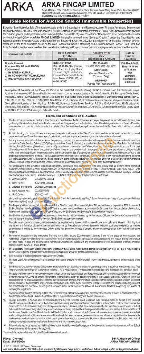Description Of Property: All that Piece and Parcel of the residential property bearing Flat No.3, Ground Floor, Sri Padmavathi Krupa Apartment admeasuring 675 Square Feet inclusive of share in common areas, situated at Old No.5/3, New No. 9/3, Ponnappa Chetty Street, Triplicane, Chennai-600005, together with 166.78 Square feet of undivided share of land out of an extent of 2750 square feet, comprised in O. S. No.610, C. C. No. 593, Old R.S.No.931/3, New R.S.No.931/8, Block No.23 of Triplicane Revenue Division, Mylapore- Triplicane Taluk, Chennal District Bounded on the: -North by: R.S.No.930, Ponnappa Chetty Street, South by: R.S. Nos.931/7, 931/10 and 931/26 belongs to Ekambara Chetty, East by: R.S. No.931/9 belongs to Govindasamy Chetty and R.S.Nos 931/10 and 931/26 belongs to Ekambara Chetty, West by: R.SNos.931/3 and 931/4 belongs to Salauddin Sahib