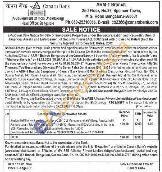 contact ARM-1 Branch, Bengaluru, Canara Bank, Ph. No. 08025310066, 9483544116, 8508442767