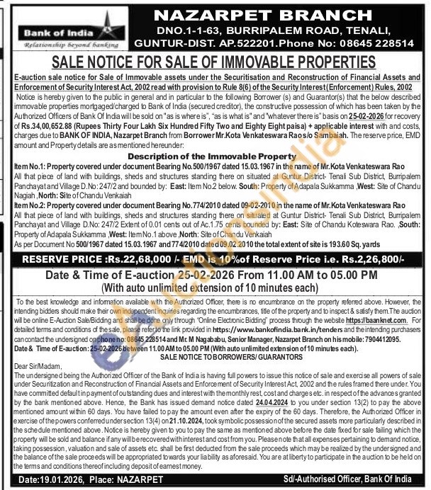 Description of the Immovable Property : Item No.1: Property covered under document Bearing No.500/1967 dated 15.03.1967 in the name of Mr. Kota Venkateswara Rao: All that piece of land with buildings, sheds and structures standing there on situated at Guntur District- Tenali Sub District, Burripalem Panchayatand Village D.No: 247/2 and bounded by: East: Item No.2 below. South: Property of Adapala Sukkamma, West: Site of Chandu Nagiah, North: Site of Chandu Venkaiah