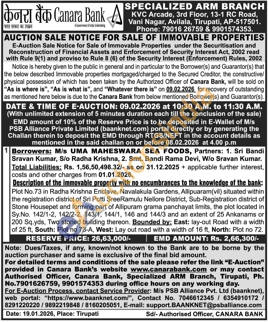 Authorised Officer Specialized ARM Branch Tirupati Phone No : 7901626759 / 9901574353