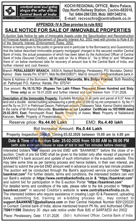 Equitable Mortgage of all parts and parcel of 6.07 Ares of land and a double storied building admeasuring a plinth area of 200.92 sq.mtr.comprised in Sy No:11 and Re Sy no.31/1 in Pathiriyad Desom, Pathiriyad amsom, Thalassery Taluk, Kannur District standing in the name of Mr.Pramod Maruvotte. Boundaries as per Location Certificate no.10519999 dated 20.02.2015. East: Panchayath Road, South: Property of Asees; West: Property of Nallakkandi Karunan; North: Property of Prasannababu.