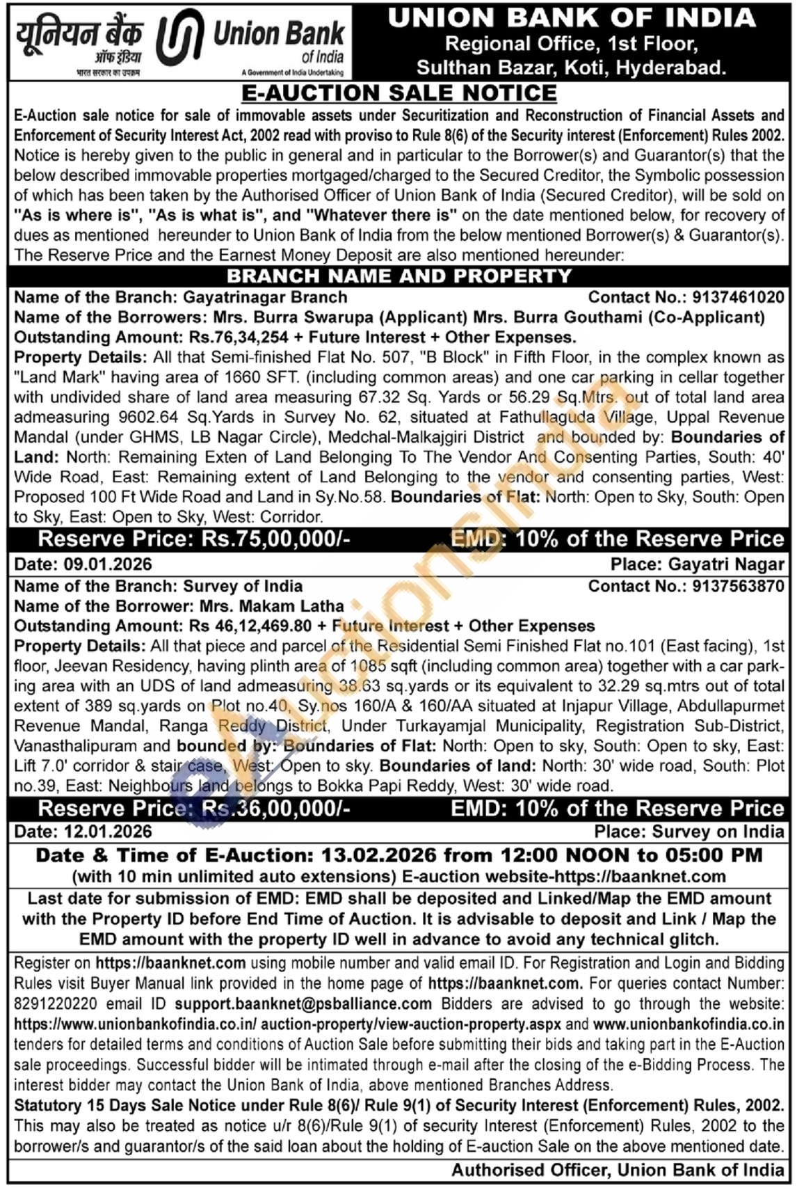 Property Details: All that Semi-finished Flat No. 507, "B Block" in Fifth Floor, in the complex known as "Land Mark" having area of 1660 SFT. (including common areas) and one car parking in cellar together with undivided share of land area measuring 67.32 Sq. Yards or 56.29 Sq.Mtrs. out of total land area admeasuring 9602.64 Sq. Yards in Survey No. 62, situated at Fathullaguda Village, Uppal Revenue Mandal (under GHMS, LB Nagar Circle), Medchal-Malkajgiri District and bounded by: Boundaries of Land: North: Remaining Exten of Land Belonging To The Vendor And Consenting Parties, South: 40' Wide Road, East: Remaining extent of Land Belonging to the vendor and consenting parties, West: Proposed 100 Ft Wide Road and Land in Sy. No.58. Boundaries of Flat: North: Open to Sky, South: Open to Sky, East: Open to Sky, West: Corridor