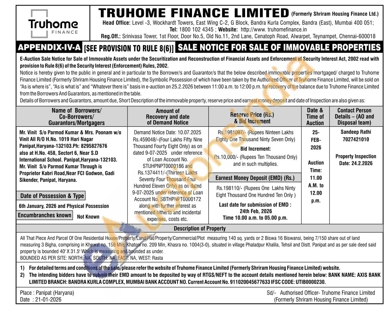 All That Piece And Parcel Of One Residential House/Property/Land/Flat/Property/Commercial/Plot measuring 140 sq. yards or 2 Biswa 16 Biswansi, being 7/150 share out of land measuring 3 Bigha, comprising in Khewat no. 156 Min, Khatoni no. 209 Min, Khasra no. 1004(3-0), situated in village Phaladpur Khalila, Tehsil and Distt. Panipat and as per sale deed said property is bounded 40' X 31.5' Which is measuring and bounded as under. BOUNDED AS PER SITE: NORTH: NA, SOUTH: NA, EAST: NA, WEST: Rasta