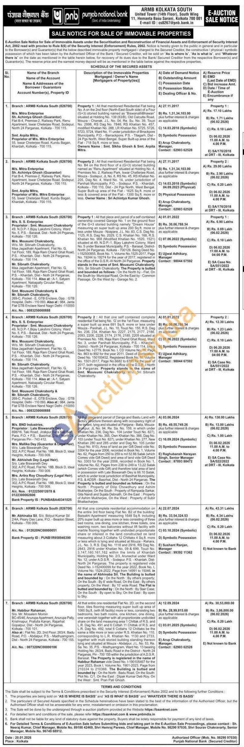 Property 1: All that mentioned Residential Flat being No. A on the 2nd floor (North-East-South side) of a Four (G+3) storied building named as "Biswanath Bhawan situated at Holding No. 139 (83/B), Old Calcutta Road, Mouza Chanak, J.L. No. 04, Re. Su. No. 39, Touzi No. 2998, RS Dag No. 7846, RS Khatian No. 457, modified Khatian No. 288, LR Khatian No. 5725, 5726. 5723, 5724, Ward No. 11 under jurisdiction of Brrackpore Municipality, P.O.- Barrackpore, P.S. - Titagarh, Dist -24 Pgs North, West Bengal. Super Built-up area of the Flat-718 Sq.ft. more or less.
