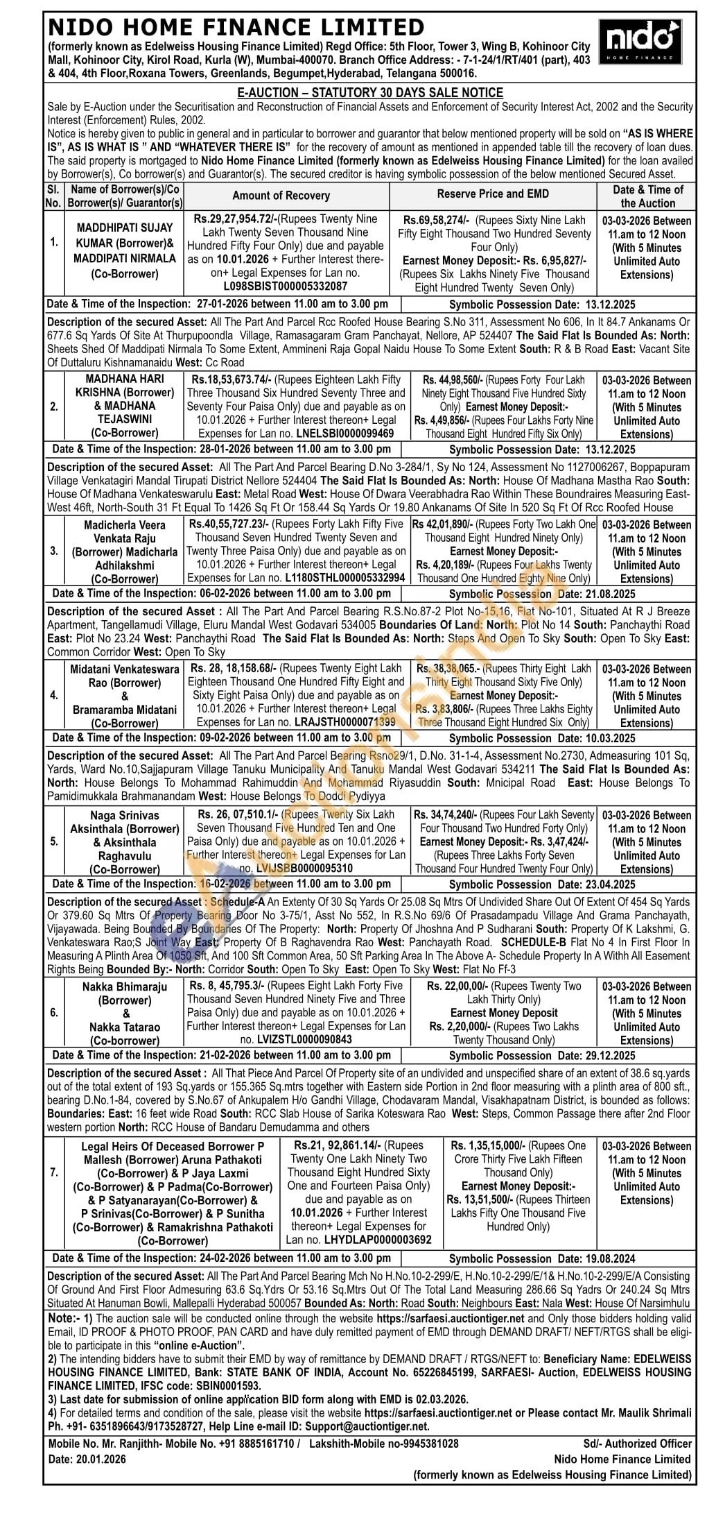 Description of the secured Asset: All That Piece And Parcel Of Property site of an undivided and unspecified share of an extent of 38.6 sq.yards out of the total extent of 193 Sq.yards or 155.365 Sq.mtrs together with Eastern side Portion in 2nd floor measuring with a plinth area of 800 sft., bearing D.No.1-84, covered by S.No.67 of Ankupalem H/o Gandhi Village, Chodavaram Mandal, Visakhapatnam District, is bounded as follows: Boundaries: East: 16 feet wide Road South: RCC Slab House of Sarika Koteswara Rao West: Steps, Common Passage there after 2nd Floor western portion North: RCC House of Bandaru Demudamma and others