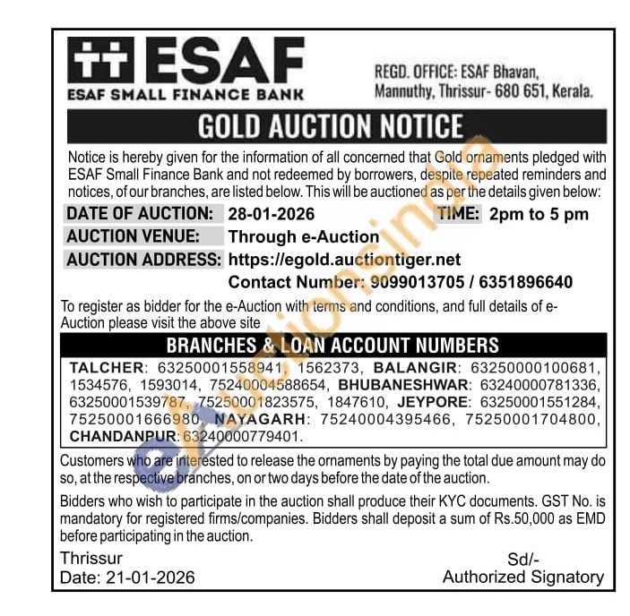 ESAF SMALL FINANCE BANK Gold Auctions Auction in Thrissur