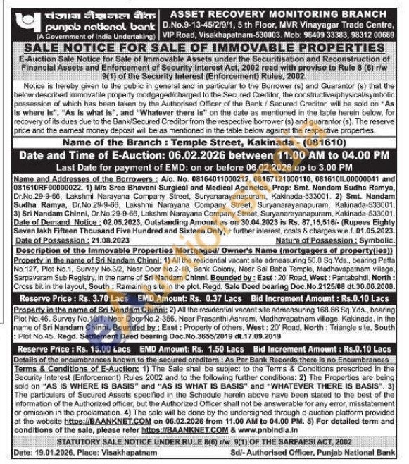 Property in the name of Sri Nandam Chinni: 1) All the residential vacant site admeasuring 50.0 Sq. Yds., bearing Patta No.127, Plot No.1, Survey No. 3/2, Near Door No.2-18, Bank Colony, Near Sai Baba Temple, Madhavapatnam village, Sarpavaram Sub Registry, in the name of Sri Nandam Chinni. Bounded by: East: 20' Road, West: Pantabahdi, North: Cross bit in the layout, South: Ramaining site in the plot. Regd. Sale Deed bearing Doc. No.2125/08 dt.30.06.2008.
