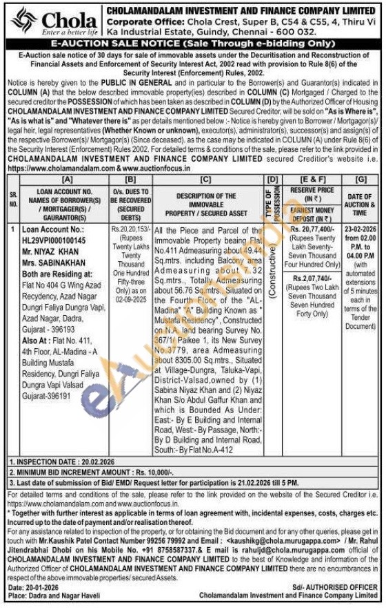 All the Piece and Parcel of the immovable Property beaing Flat No.411 Admeasuring about 49.44 Sq.mtrs. including Balcony area Admeasuring about 7.32 Sq.mtrs., Totally Admeasuring about 56.76 Sq.mtrs., Situated on the Fourth Floor of the "AL-Madina" "A" Building Known as " Mustafa Residency", Constructed on N.A. land bearing Survey No. 367/1/ Paikee 1, its New Survey No.3779, area Admeasuring about 8305.00 Sq.mtrs., Situated at Village-Dungra, Taluka-Vapi, District-Valsad,owned by (1) Sabina Niyaz Khan and (2) Niyaz Khan Sio Abdul Gaffur Khan and which is Bounded As Under: East- By E Building and Internal Road, West:-By Passage, North:-By D Building and Internal Road, South:-By Flat No.A-412