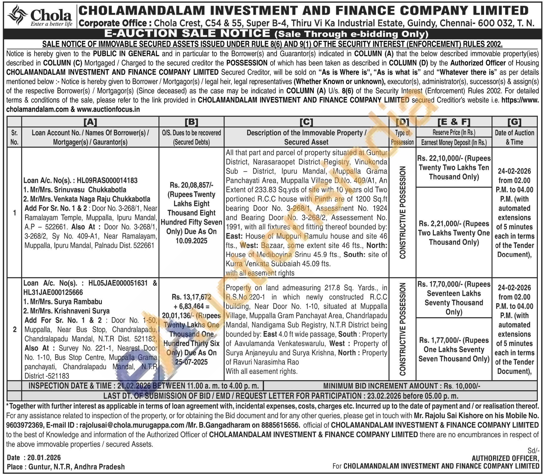 All that part and parcel of property situated at Guntur District, Narasaraopet District Registry, Vinukonda Sub District, Ipuru Mandal, Muppalla Grama Panchayati Area, Muppalla Village D.No. 409/A1, An Extent of 233.83 Sq.yds of site with 10 years old Two portioned R.C.C house with Plinth are of 1200 Sq.ft bearing Door No. 3-268/1, Assessment No. 1924 and Bearing Door No. 3-268/2, Assessement No. 1991, with all fixtures and fitting thereof bounded by: East: House of Muppuri Ramulu house and site 46 fts., West: Bazaar, some extent site 46 fts., North: House of Mediboyina Srinu 45.9 fts., South: site of Kurra Venkata Subbaiah 45.09 fts. with all easement rights