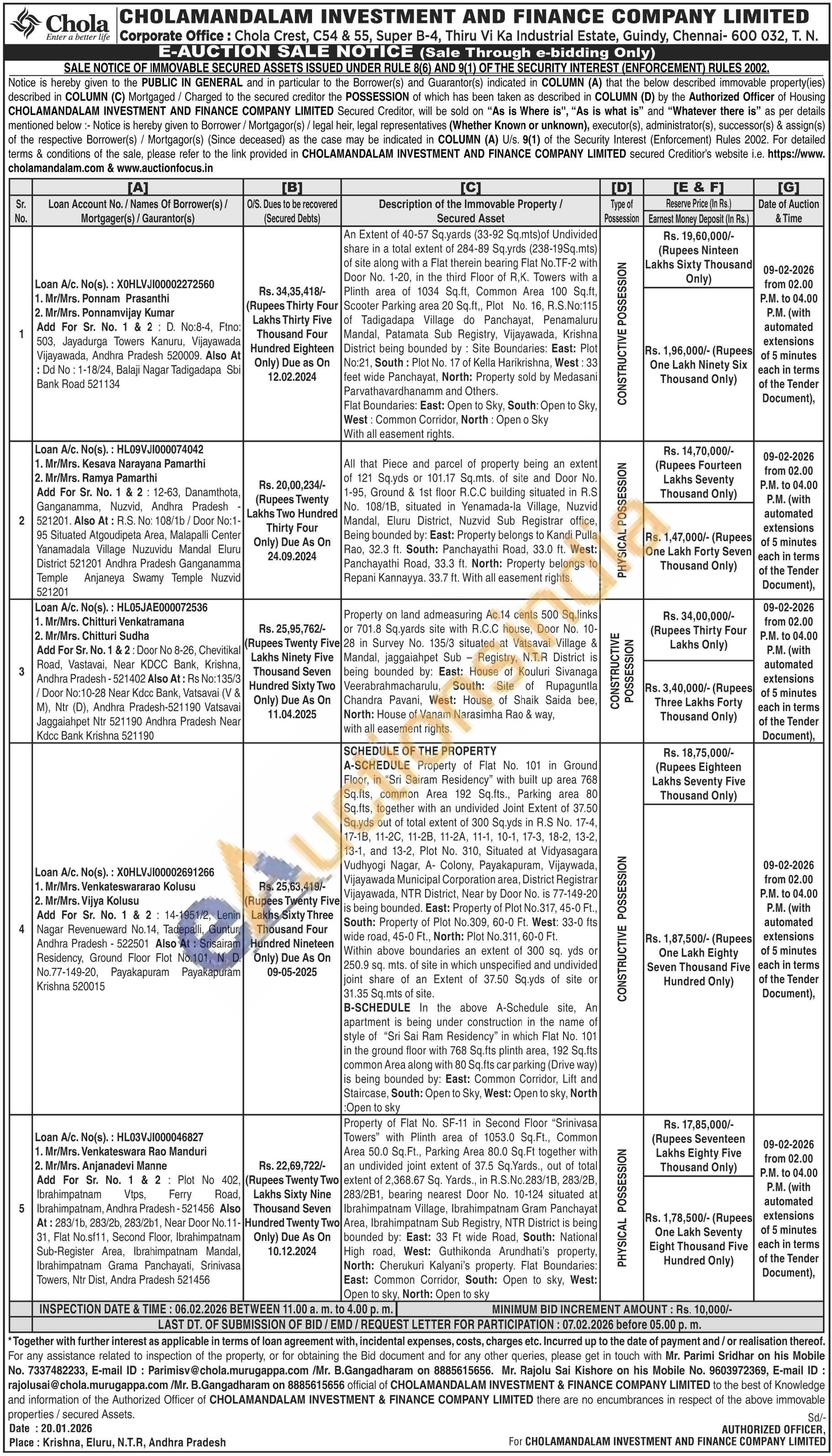 Property of Flat No. SF-11 in Second Floor "Srinivasa Towers" with Plinth area of 1053.0 Sq.Ft., Common Area 50.0 Sq.Ft., Parking Area 80.0 Sq.Ft together with an undivided joint extent of 37.5 Sq. Yards., out of total extent of 2,368.67 Sq. Yards., in R.S.No.283/1B, 283/2B, 283/2B1, bearing nearest Door No. 10-124 situated at Ibrahimpatnam Village, Ibrahimpatnam Gram Panchayat Area, Ibrahimpatnam Sub Registry, NTR District is being bounded by: East: 33 Ft wide Road, South: National High road, West: Guthikonda Arundhati's property, North: Cherukuri Kalyani's property. Flat Boundaries: East: Common Corridor, South: Open to sky, West: Open to sky, North: Open to sky