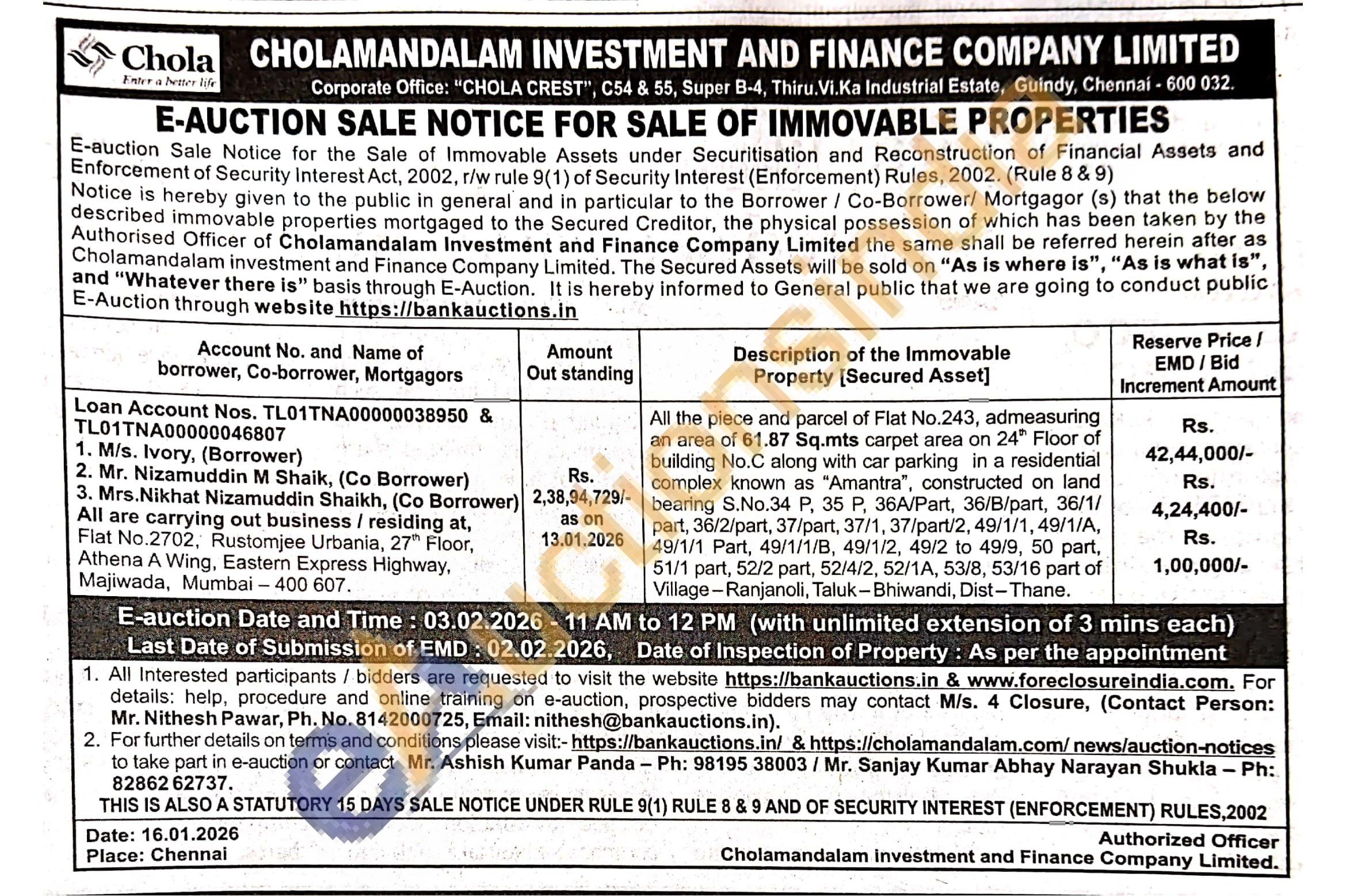 All the piece and parcel of Flat No.243, admeasuring an area of 61.87 Sq.mts carpet area on 24th Floor of building No.C along with car parking in a residential complex known as "Amantra", constructed on land part, 36/2/part, 37/part, 37/1, 37/part/2, 49/1/1, 49/1/A, 49/1/1 Part, 49/1/1/8, 49/1/2, 49/2 to 49/9, 50 part, 51/1 part, 52/2 part, 52/4/2, 52/1A, 53/8, 53/16 part of Village-Ranjanoli, Taluk-Bhiwandi, Dist-Thane. bearing S.No.34 P, 35 P, 36A/Part, 36/B/part, 36/1/