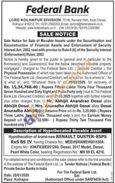 Hypothecation of brand-new RENAULT DUSTER-85PS RXS BS IV, having Chassis No.: MEEHSRAWEH6015504, Engine No.: K9KF830E051260, Diesel, 2017 Model, Diesel, Pearl White Color, bearing Registration No.: MH 09 EL 4216