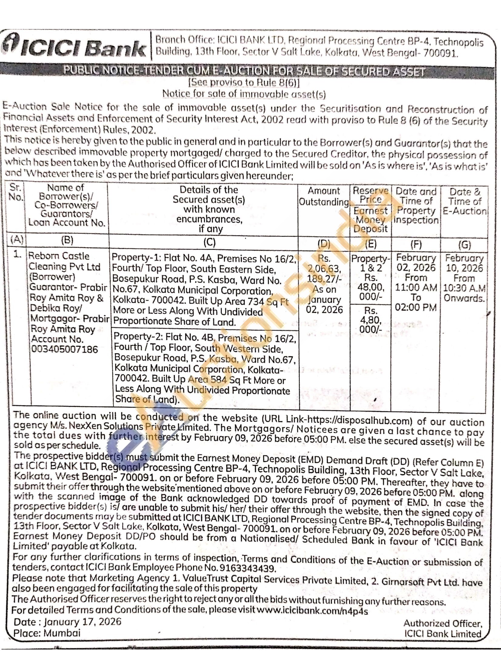 Property-1: Flat No. 4A, Premises No 16/2, Fourth/Top Floor, South Eastern Side, Bosepukur Road, P.S. Kasba, Ward No. No.67, Kolkata Municipal Corporation, Kolkata-700042. Built Up Area 734 Sq Ft More or Less Along With Undivided Proportionate Share of Land. Property-2: Flat No. 4B, Premises No 16/2, Fourth/Top Floor, South Western Side, Bosepukur Road, P.S. Kasba, Ward No.67, Kolkata Municipal Corporation, Kolkata-700042. Built Up Area 584 Sq Ft More or Less Along With Undivided Proportionate Share of Land).