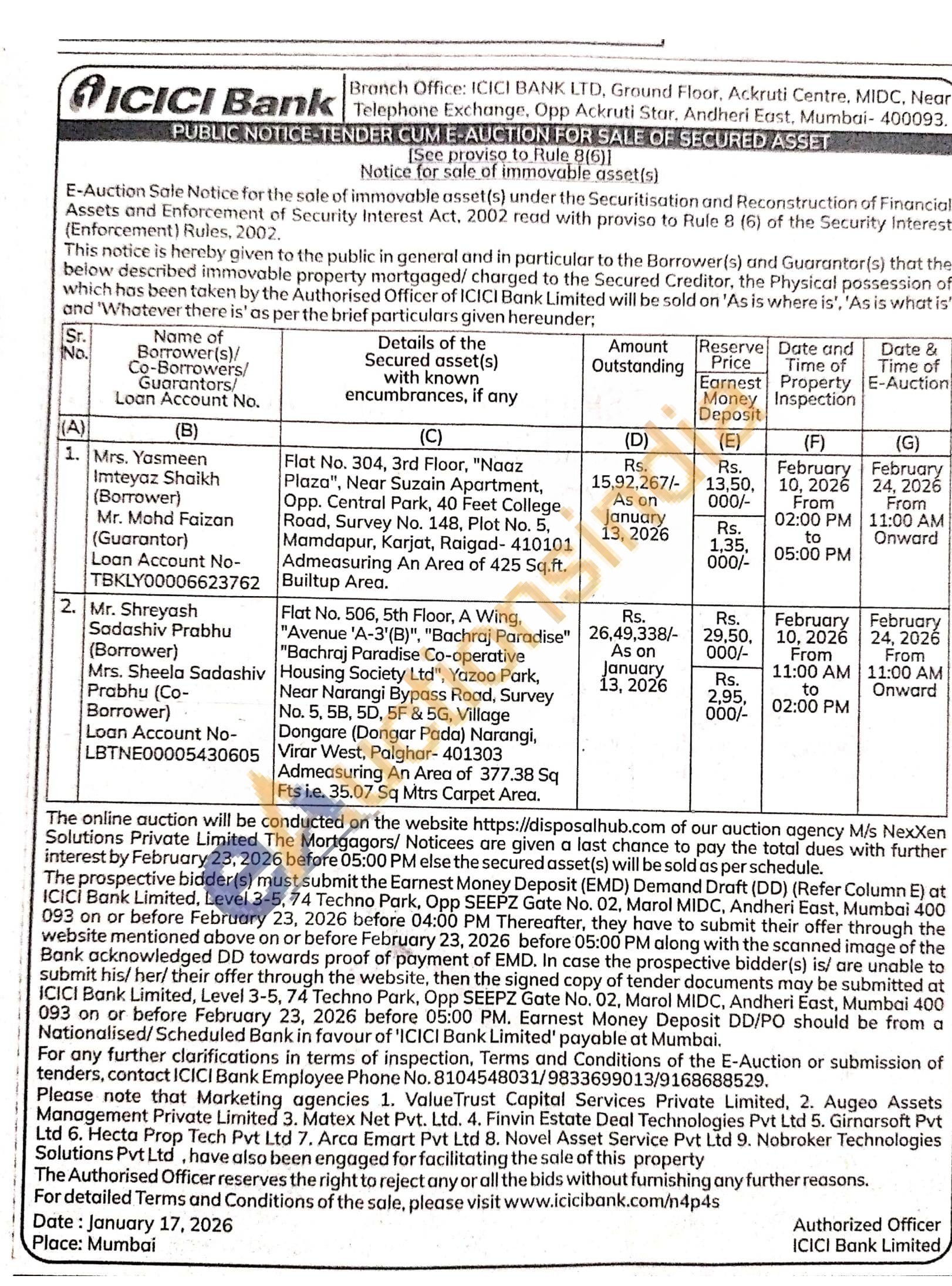 Flat No. 506, 5th Floor, A Wing, "Avenue 'A-3'(B)", "Bachraj Paradise" "Bachraj Paradise Co-operative Housing Society Ltd", Yazoo Park, Near Narangi Bypass Road, Survey No. 5, 5B, 5D, 5F & 5G, Village Dongare (Dongar Pada) Narangi, Virar West, Palghar- 401303 Admeasuring An Area of 377.38 Sq Fts i.e. 35.07 Sq Mtrs Carpet Area