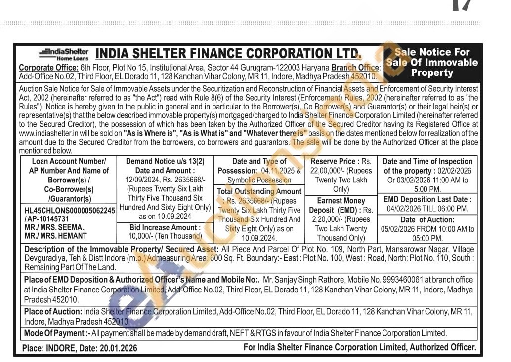 Description of the Immovable Property/ Secured Asset: All Piece And Parcel Of Plot No. 109, North Part, Mansarowar Nagar, Village Devguradiya, Teh & Distt Indore (m.p.) Admeasuring Area: 600 Sq. Ft. Boundary:- East: Plot No. 100, West: Road, North: Plot No. 110, South: Remaining Part Of The Land.