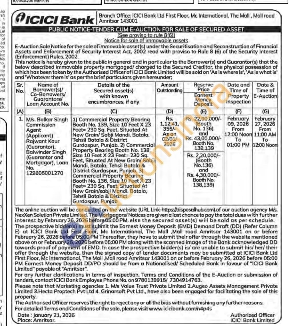 1) Commercial Property Bearing Booth No. 139, Size 10 Feet X 23 Feet 230 Sq. Feet, Situated At New Grain/Sabji Mandi, Batala, Tehsil Batala & District Gurdaspur, Punjab. 2) Commercial Property Bearing Booth No. 138, Size 10 Feet X 23 Feet 230 Sq. Feet, Situated At New Grain/ Sabji Mandi, Batala, Tehsii Batala & District Gurdaspur, Punjab. 3