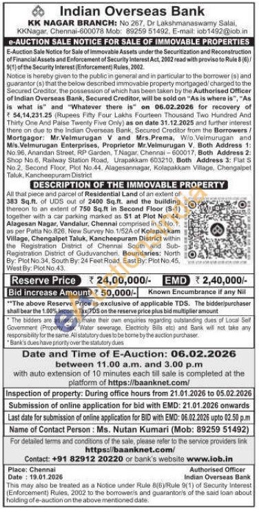 All that piece and parcel of Residential Land of an extent of 383 Sq.ft. of UDS out of 2400 Sq.ft. and the building thereon to an extent of 750 Sq.ft in Second Floor (S-1) together with a car parking marked as S1 at Plot No. 44, Alagesan Nagar, Vandalur, Chennal comprised in S.No. 1. as per Patta No. 826, New Survey No. 1/52A of Kolapakkam Village, Chengalpet Taluk, Kancheepuram District within the Registration District of Chennai South and Sub-Registration District of Guduvancheri, Boundaries: North By: Plot No. 34, South By: 24 Feet Road, East By: Plot No 45. West By: Plot No.43