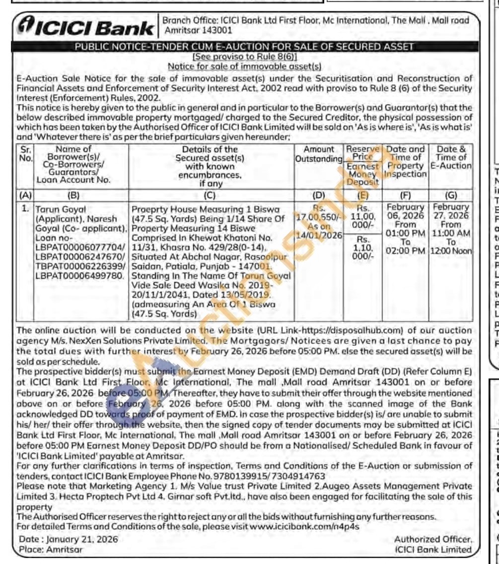 Proeprty House Measuring 1 Biswa (47.5 Sq. Yards) Being 1/14 Share Of Property Measuring 14 Biswe Comprised In Khewat Khatoni No. 11/31, Khasra No. 429/28(0-14). Situated At Abchal Nagar, Rasoolpur Saidan, Patiala, Punjab-147001. Standing In The Name Of Tarun Goyal Vide Sale Deed Wasika No. 2019-20/11/1/2041, Dated 13/05/2019. (admeasuring An Area Of 1 Biswa (47.5 Sq. Yards)