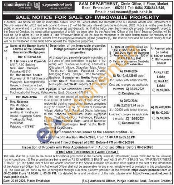 All that part and parcel of property consisting of total extent of 0.0125 Hectare of land along with residential building constructed thereon comprised In Sy No. 129/82, Re. Sy. No. 39/10 of Puthucode Village, Alathur Taluk, Palakkad District belonging to Mrs. Nabeesa, Palathutara House, Ayyappan Kunnu Thekkepotta Post. Putitukode. Palakkad-678687. Boundaries: East: Land of Nabeesa South: Anjali Kudiyiruppu: West: Vazhy: North: Aisumma Kudiyiruppu