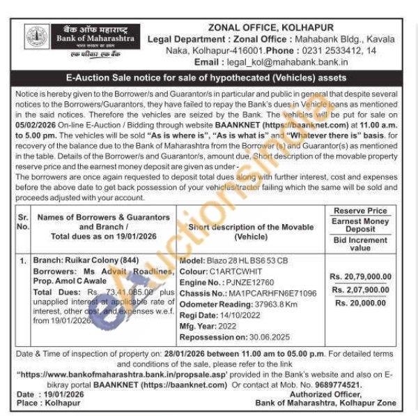 Model: Blazo 28 HL BS653 CB Colour: C1ARTCWHIT Engine No.: PJNZE12760 Chassis No.: MA1PCARHFN6E71096 Odometer Reading: 37963.8 Km Regi Date: 14/10/2022 Mfg. Year: 2022 Repossession on: 30.06.2025