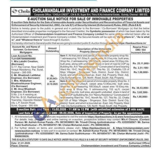 Item 1: All that piece and parcel of immovable property shop No. 1 admeasuring 161.50sq.ft. carpet area, 16.31sq.mts. built area. Shop No. 2 admeasuring 199.50sq.ft. carpet area, 19.93sq.mts. built area, along with undivided share in land of road & COP og Building No. A in "Nency Residency" Construsted of land bearing Ward No. 19-C, Nondh No. 127, Tika No. 22. Chaita No. 125 of Mojo Villagae: Singanpor, Sub-District. Surat City, District Surat, and which is bounded as-East: Adj. Property, West: Adj City Survycahita no. 126. North Road, South: Adj Property.