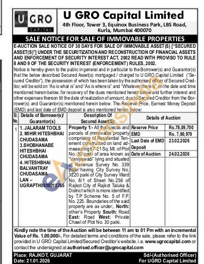 Property 1:- All that pieces and parcels of immovable property comprising of Residential Ten-ement constructed on land ad-measuring 67-21 Sq. Mt. of Plot No. 30 paiki of area known as "Vaniyawadi lying and situated at Revenue Survey No. 339 paiki having City Survey No. 1220 paiki of City Survey Ward No. 8/1 of Sheet No.256 of Rajkot City of Rajkot Taluka & District which is more identified by T.P Scheme No. 5 of F.P. No. 225. Boundaries of the said property are as under,. North: other's Property South: Road East: Road West: Private Chawl of Plot No. 30 paiki.