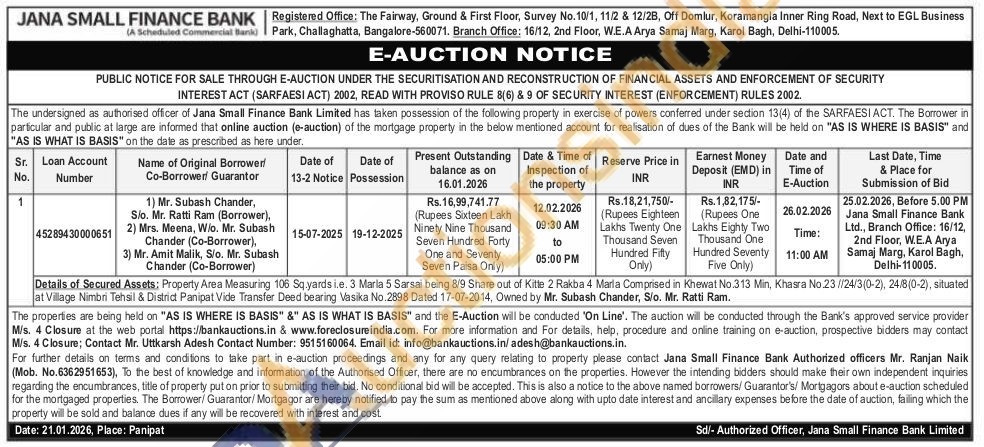 Details of Secured Assets: Property Area Measuring 106 Sq.yards i.e. 3 Marla 5 Sarsai being 8/9 Share out of Kitte 2 Rakba 4 Marla Comprised in Khewat No.313 Min, Khasra No 23//24/3(0-2), 24/8(0-2), situated at Village Nimbri Tehsil & District Panipat Vide Transfer Deed bearing Vasika No. 2898 Dated 17-07-2014, Owned by Mr. Subash Chander, S/o. Mr. Ratti Ram.