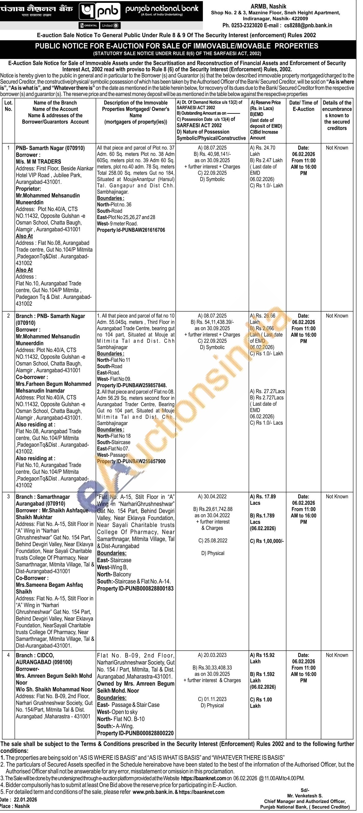 Flat No. B-09, 2nd Floor, Narhari Grushneshwar Society, Gut No. 154/Part, Mitmita, Tal & Dist. Aurangabad, Maharastra-431001. Owned by Mrs. Amreen Begum Seikh Mohd. Noor Boundaries: East- Passage & Stair Case West-Open to sky North- Flat NO. B-10 South:-A-Wing. Property ID-PUNB000828800220