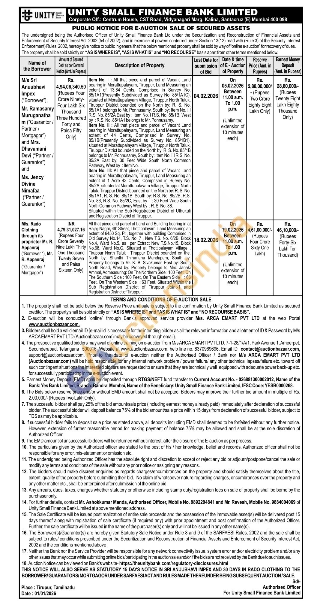 Item No. 1: All that piece and parcel of Vacant Land bearing in Morattupalayam, Tiruppur, Land Measuring an extent of 13.84 Cents, Comprised in Survey No. 85/1A1(Presently Subdivided as Survey No. 85/1A1C), situated at Morattupalayam Village, Tiruppur North Taluk, Tiruppur District bounded on the North by: R. S. No. 85/1A1 belongs to Mr. Ponnusamy, South by: Item No. III R.S. No. 85/2A East by: Item No. IR.S. No. 85/1B, West by: R.S. No. 85/1A1 belongs to Mr. Ponnusamy. Item No. II: All that piece and parcel of Vacant Land bearing in Morattupalayam, Tiruppur, Land Measuring an extent of 44 Cents, Comprised in Survey No. 85/1B(Presently Subdivided as Survey No. 85/181), situated at Morattupalayam Village, Tiruppur North Taluk, Tiruppur District bounded on the North by: R. S. No. 85/18 belongs to Mr. Ponnusamy, South by: Item No. III R.S. No. 85/2A East by: 30 Feet Wide South North Common Pathway, West by: Item No. I. Item No. III: All that piece and parcel of Vacant Land bearing in Morattupalayam, Tiruppur, Land Measuring an extent of 1 Acre 43 Cents, Comprised in Survey No. 85/2A, situated at Morattupalayam Village, Tiruppur North Taluk, Tiruppur District bounded on the North by: R. S. No. 85/1A1, R. S. No. 85/1B. South by: R.S. No. 85/2B, R.S. No. 86, R.S. No. 85/2C, East by 30 Feet Wide South North Common Pathway West by: R. S. No. 88. Situated within the Sub-Registration District of Uthukuli and Registration District of Tiruppur