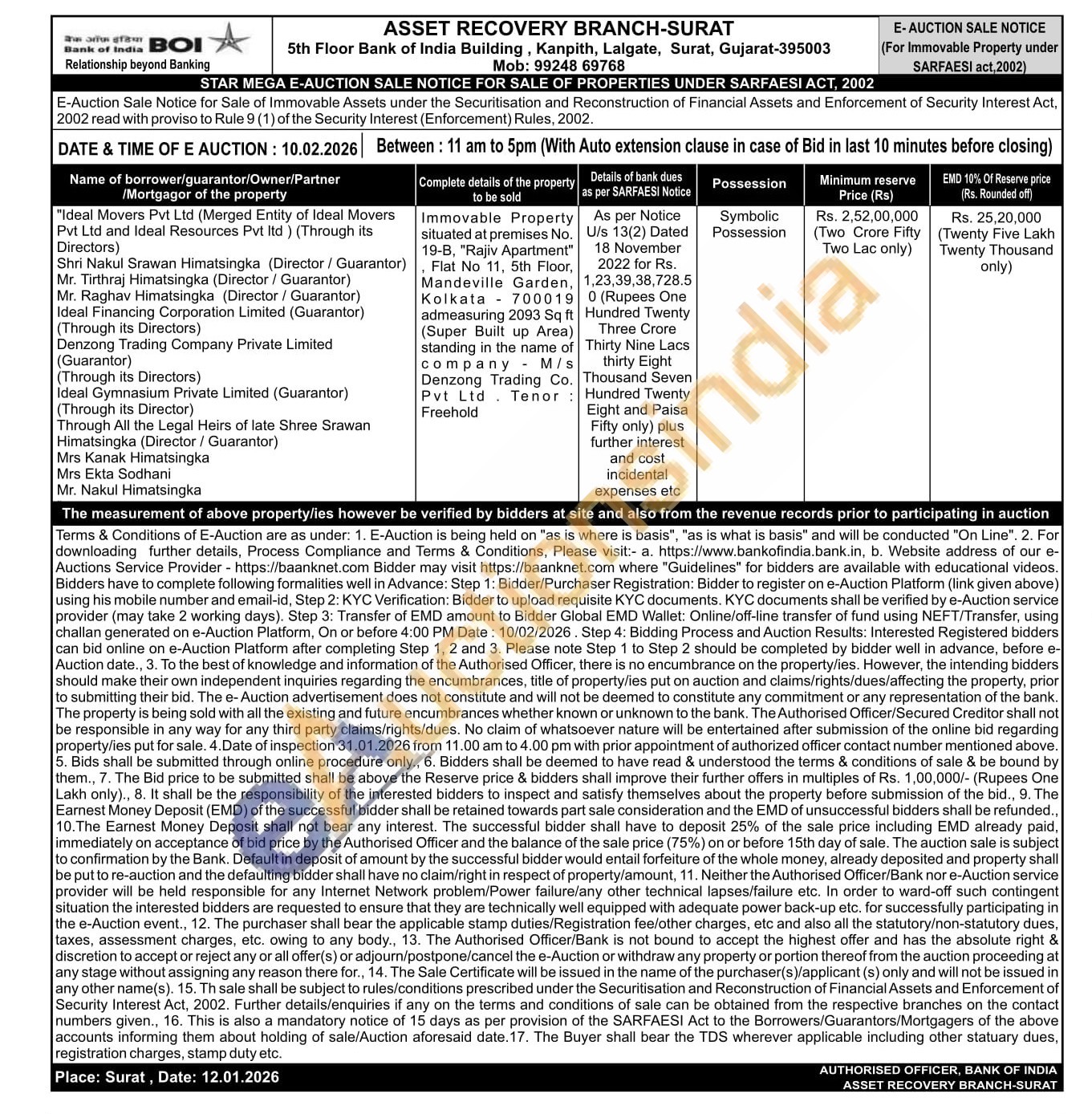 Immovable Property situated at premises No.19-B, "Rajiv Apartment" Flat No 11, 5th Floor, Mandeville Garden, Kolkata 700019 admeasuring 2093 Sq ft (Super Built up Area) standing in the name of company M/s Denzong Trading Co. Pvt Ltd Freehold Tenor
