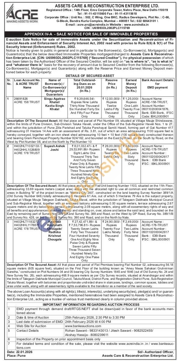 Description Of The Secured Asset: All that piece and parcel of Flat/Unit bearing Number 1103, situated on the 11th Floor, admeasuring 33,69 square meters (carpet area) along with the allocated right to use all common and restricted common areas in Building "B" of the project iknown as "Mantra City 360, constructed on the land bearing Survey Number 380/1/A (Old Survey Number 646) totally admeasuring & Hectares 61 Are, out of which 5 Hectares 79 Are is the subject property, situated at Village Mouje Talegaon Dabhade, Taluka Maval, within the jurisdiction of Talegaon Dabhade Municipal Council and Sub-Registrar Maval, together with an enclosed balcony admeasuring 0.00 square meters, terrace admeasuring 2.67 square meters and dry balcony/dry terrace admeasuring 2.08 square meters, along with all easementary rights of way and all benefits and appurtenances attached thereto and standing on, over, above and below the said land, and bounded on the East by remaining part of Survey No. 389/1/A and Survey No. 388 and Road, on the West by DP Road, Survey No. 389/1/8