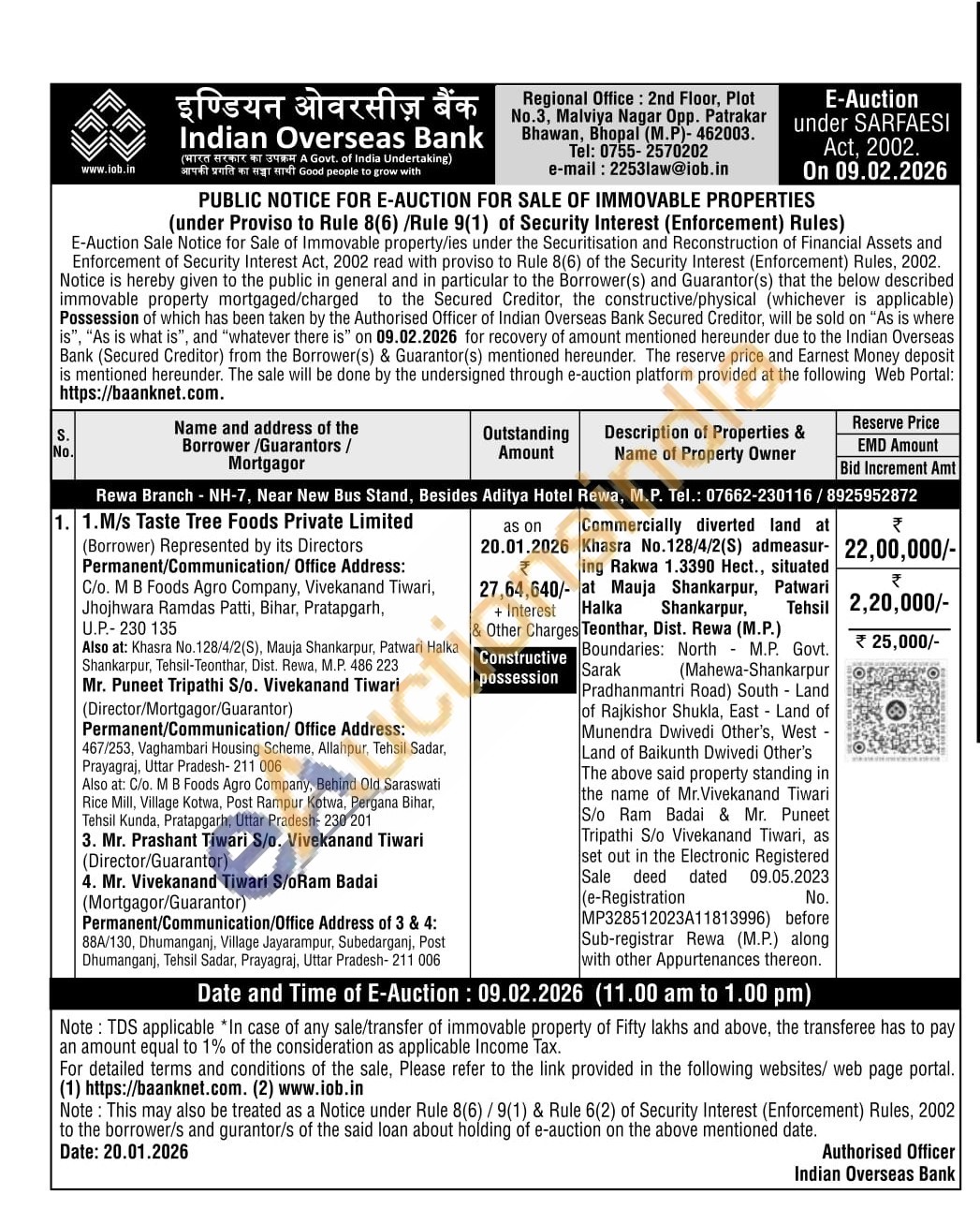 Commercially diverted land at Khasra No.128/4/2(S) admeasur-ing Rakwa 1.3390 Hect., situated at Mauja Shankarpur, Patwari Halka Shankarpur, Tehsil Teonthar, Dist. Rewa (M.P.) Boundaries: North M.P. Govt. Sarak (Mahewa-Shankarpur Pradhanmantri Road) South Land of Rajkishor Shukla, East Land of Munendra Dwivedi Other's, West -Land of Baikunth Dwivedi Other's The above said property standing in the name of Mr.Vivekanand Tiwari S/o Ram Badai & Mr. Puneet Tripathi S/o Vivekanand Tiwari, as set out in the Electronic Registered Sale deed dated 09.05.2023 (e-Registration No. MP328512023A11813996) before Sub-registrar Rewa (M.P.) along with other Appurtenances thereon.