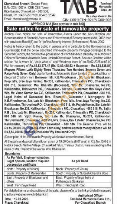 All the parts and parcel of land to an extent of 15.00 Cents (6.07 ares) in R.S.No. 15/6-2 in Nattika Beach, Nattika Village, Chavakkad Taluk, Thrissur District, Kerala standing in the name of Mrs. Bharathi Bhaskaran, Wio. Bhaskaran Boundaries