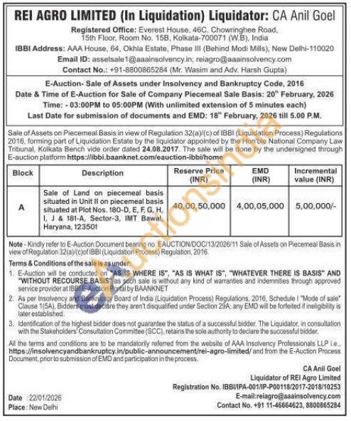 Sale of Land on piecemeal basis situated in Unit II on piecemeal basis situated at Plot Nos. 180-D, E, F, G, H, 1, J & 181-A, Sector-3, IMT Bawal, Haryana, 123501