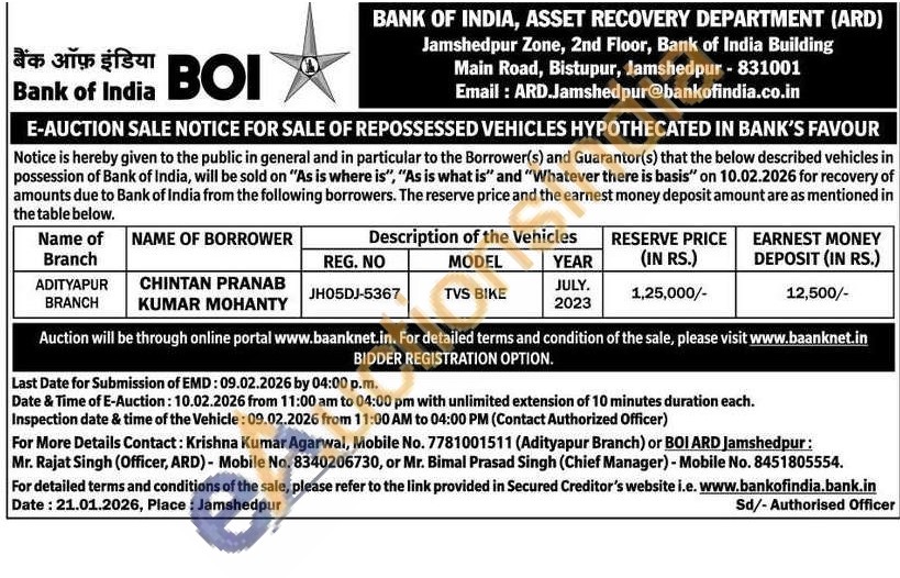 Contact: Krishna Kumar Agarwal, Mobile No. 7781001511 (Adityapur Branch) or BOI ARD Jamshedpur: Mr. Rajat Singh (Officer, ARD) - Mobile No. 8340206730, or Mr. Bimal Prasad Singh (Chief Manager) - Mobile No. 8451805554