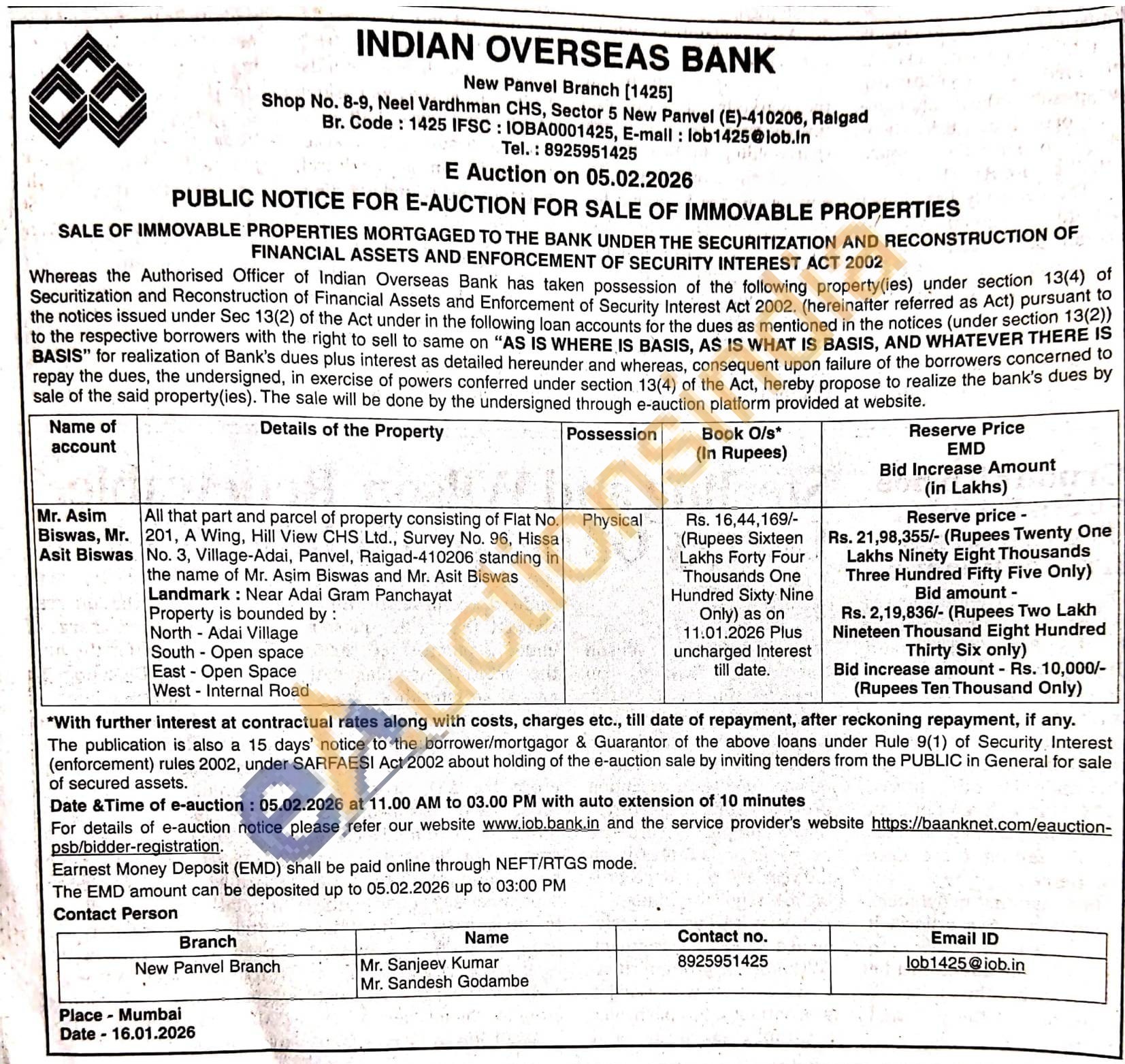 All that part and parcel of property consisting of Flat No. No. 3, Village-Adai, Panvel, Raigad-410206 standing in 201, A Wing, Hill View CHS Ltd., Survey No. 96, Hissa the name of Mr. Asim Biswas and Mr. Asit Biswas Landmark: Near Adai Gram Panchayat