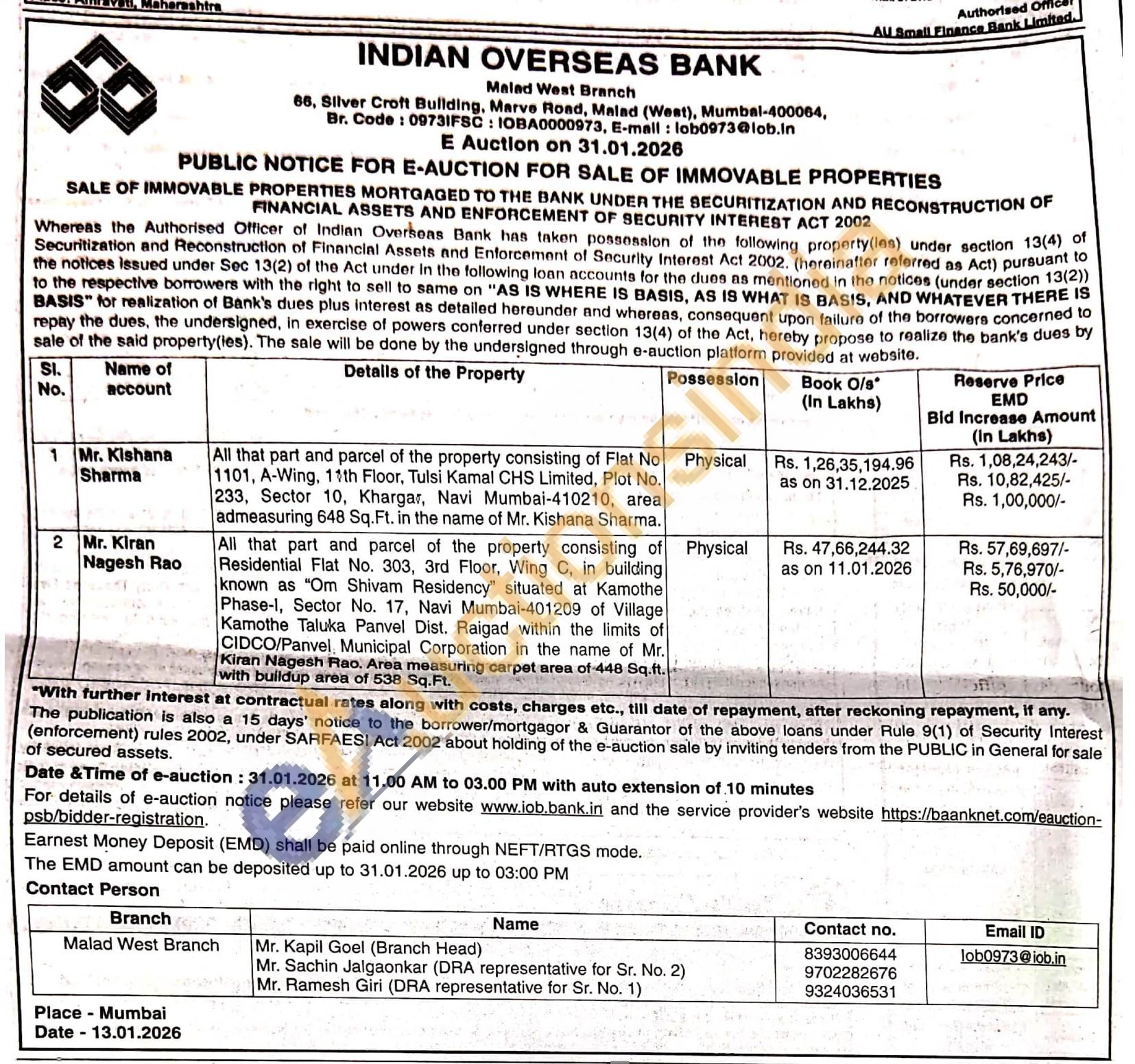 All that part and parcel of the property consisting of Flat No 1101, A-Wing, 11th Floor, Tulsi Kamal CHS Limited, Plot No. 233, Sector 10, Khargar, Navi Mumbai-410210, area admeasuring 648 Sq.Ft. in the name of Mr. Kishana Sharma