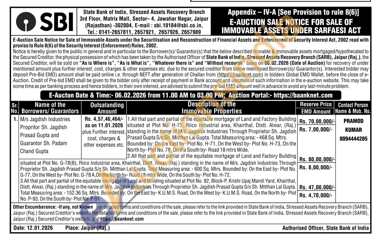 2.All that part and partial of the equitable mortgage of Land and Factory Buildingsituated at Plot No. G-78(B), Riico Industrial area, Khairthal, Distt. Alwar, (Raj.) standing in the name of M/s. Jagdish Industries ThroughProprietor Sh. Jagdish Prasad Gupta S/o Sh. Mitthan Lal Gupta. Total Measuring area: - 600 Sq. Mtrs. Bounded by: On the East by- Plot No. G-77, On the West by- Plot No. G-78 A, On the North by-Road 18 mtrs Wide, On the South by- Plot No. H-72,