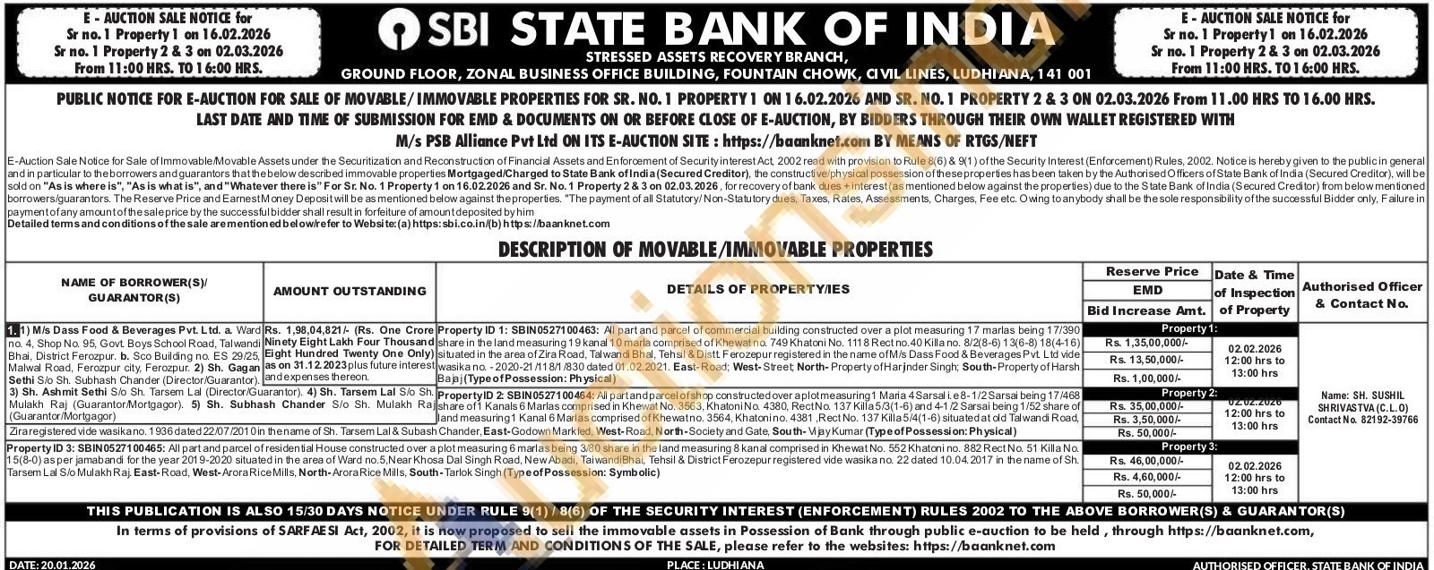 Property ID 1: SBIN0527100463: All part and parcel of commercial building constructed over a plot measuring 17 marlas being 17/390 share in the land measuring 19 kanal 10 marla comprised of Khewat no. 749 Khatoni No. 1118 Rect no. 40 Killa no. 8/2(8-6) 13(6-8) 18(4-16) situated in the area of Zira Road, Talwandi Bhal, Tehsil & Distt Ferozepur registered in the name ofM/s Dass Food & Beverages Pvt Ltd vide wasika no-2020-21/118/1/830 dated 01.02.2021. East-Road: West-Street North-Property of Harinder Singh, South-Property of Harsh Bajaj