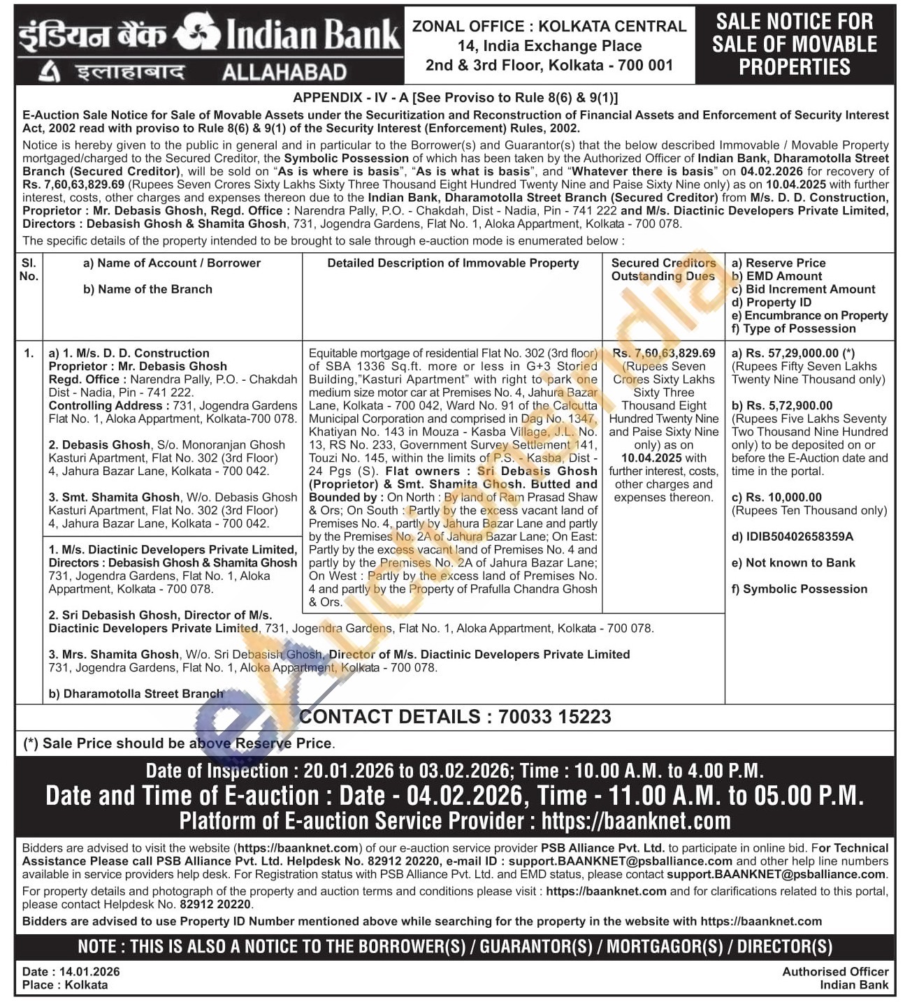 Equitable mortgage of residential Flat No. 302 (3rd floor) of SBA 1336 Sq.ft. more or less in G+3 Storied Building. "Kasturi Apartment with right to park one medium size motor car at Premises No. 4, Jahura Bazar Lane, Kolkata 700 042, Ward No. 91 of the Calcutta Municipal Corporation and comprised in Dag No. 1347, Khatiyan No. 143 in Mouza Kasba Village, J.L. No. 13, RS No. 233, Government Survey Settlement 141, Touzi No. 145, within the limits of P.S. Kasba, Dist -24 Pgs (S). Flat owners: Sri Debasis Ghosh (Proprietor) & Smt. Shamita Ghosh. Butted and Bounded by: On North: By land of Ram Prasad Shaw & Ors; On South Partly by the excess vacant land of Premises No. 4, partly by Jahura Bazar Lane and partly by the Premises No. 2A of Jahura Bazar Lane; On East: Partly by the excess vacant land of Premises No. 4 and partly by the Premises No. 2A of Jahura Bazar Lane; On West: Partly by the excess land of Premises No. 4 and partly by the Property of Prafulla Chandra Ghosh & Ors.