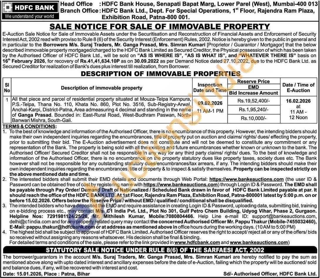 All that piece and parcel of residential property situated at Mouza-Telpa Karnpura, P.S.-Telpa, Thana No. 110, Khata No. 860, Plot No. 3516, Sub-Registry-Arwal, Anchal-Karpi, District-Patna, Area admeasuring 4 decimal and standing in the name of Ganga Prasad. Bounded in: East-Rural Road, West-Budhram Paswan, North-Banwari Mishra, South-Gali.