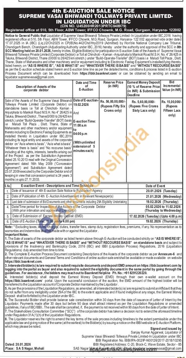 Sale of the Assets of the Supreme Vasai Bhiwandi Tollways Private Limited (Corporate Debtor) on standalone basis le Toll at Chinchoti- Kaman Anjurphata to Mankoli Road MS.H. No 4° 26/425 in Taluka, Bhiwandi District, Thane (0/000 to 26/425 km stretch.) under "Build-Operate-Transfer (BOT) basis ie Maludi Toll Plaza, Distt. Thane, State of Maharastra and other machinery and/or equipment thereto including to Electronic Fastag Equipments as installed thereto in Liquidation under IBC,2016 including its legal entity and assets of the corporate debtor on "As is where is basis", "As is what is basis", Whatever there is basis" and "No recourse basis including all the rights, interests, benefits arising our of the Project as per the Substitution Agreement dated 25.10.2013 read with the Original Concession Agreement dated 16th May 2009 (Concession Agreement) and Substitution Agreement dated 23.07.2009 executed by the Corporate Debtor and of keeping in view that concession period is 24 years 3 monthsi.e upto 27.11.2033.