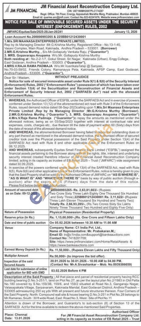 Description of the Said Property: All that piece and parcel of residential property having RCC building bearing D.No. 3-251/1, land on Plot No.27, as per the layout plan No 2/1983 in Old Patta No. 180 covered by S.No. 159/38, 159/6, and 159/2 situated at Road No.3, Gangaraju Nagar, Valasapakala Village, Sarpavaram, Kakinada Mandal, East Godavari District, Andhra Pradesh-533005 adm admeasuring 250 sq yds With all present and future structures thereon. Four Corners of the Said Property: North: Compound wall site & house bearing D.No.3-251 in Plot No.28 belongs to Mr.Ramarao, South: 30 ft wide Road, East: Road No.3. West: Site of Plot No.