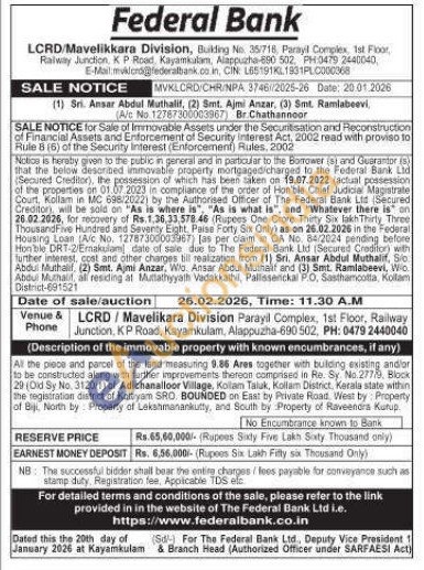 All the piece and parcel of the land measuring 9.86 Ares together with building existing and or to be constructed along with farther improvements thereon comprised in Re. Sy No 2779, Black 29 (Did Sy No. 3120/1) of Adichanalloor Village, Kolam Taluk, Kollam District, Kerala state within the registration district of Kottyam SRO BOUNDED on East by Private Roard. West by: Property of Bij North by Property of Lakshmanankutty, and South by Property of Raveenors Kurup