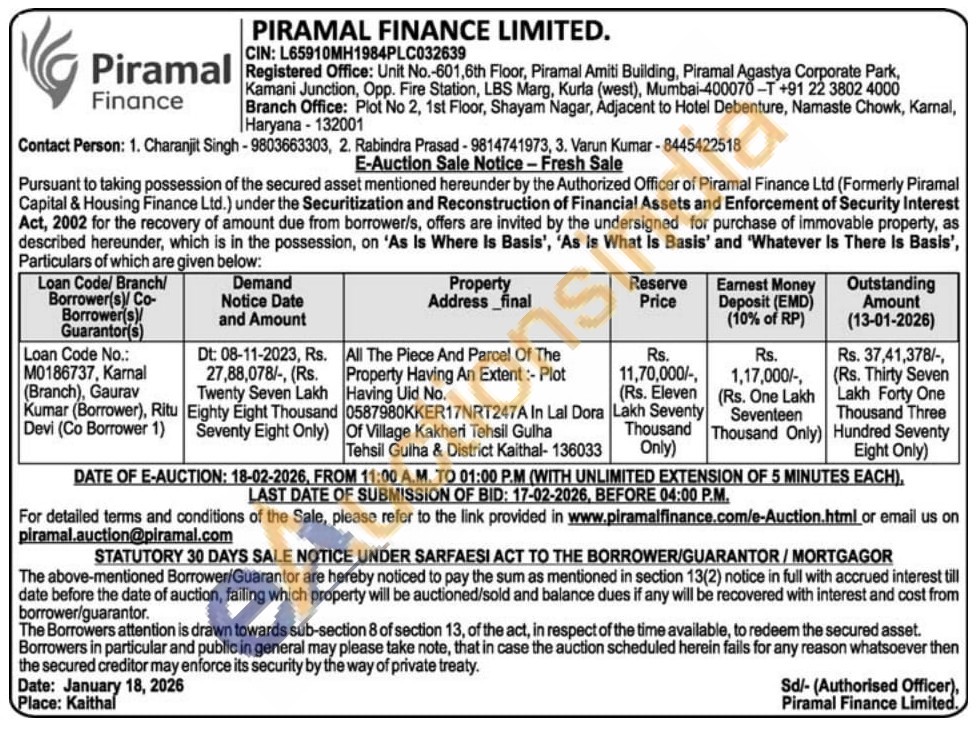 All The Piece And Parcel Of The Property Having An Extent :- Plot Having Uid No. 0587980KKER17NRT247A In Lal Dora Of Village Kakheri Tehsil Gulha Tehsil Gulha & District Kaithal- 136033