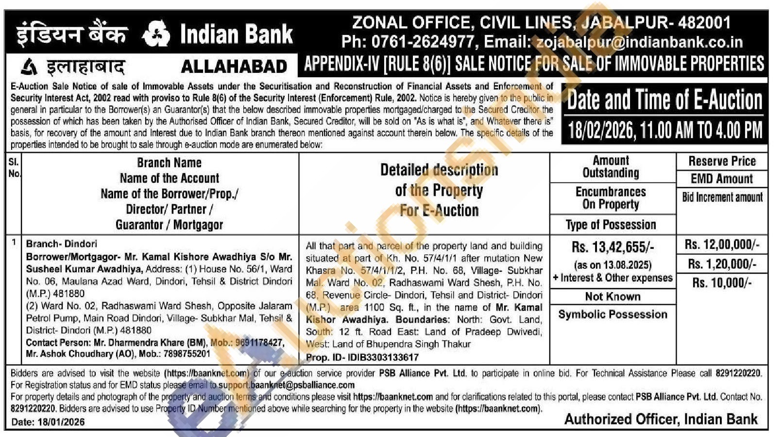 All that part and parcel of the property land and building situated at part of Kh. No. 57/4/1/1 after mutation New Khasra No. 57/4/1/1/2, P.H. No. 68, Village- Subkhar Mal. Ward No. 02, Radhaswami Ward Shesh, P.H. No. 68, Revenue Circle- Dindori, Tehsil and District- Dindori (M.P.) area 1100 Sq. ft., in the name of Mr. Kamal Kishor Awadhiya. Boundaries: North: Govt. Land, South: 12 ft. Road East: Land of Pradeep Dwivedi, West: Land of Bhupendra Singh Thakur