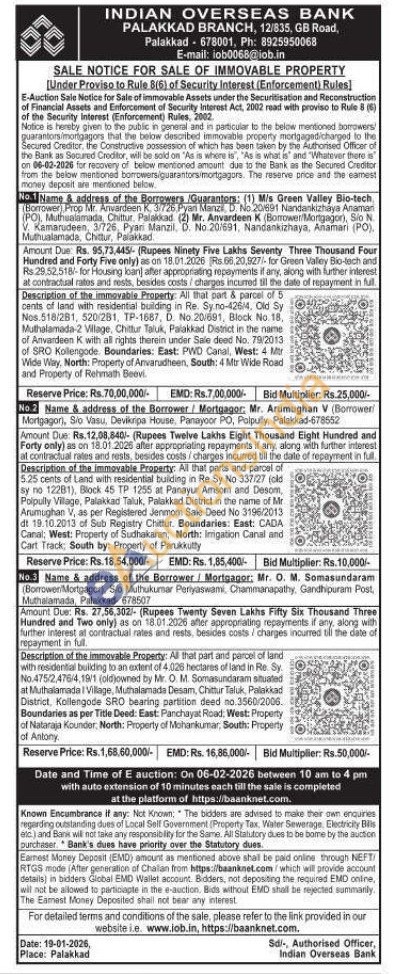 3) All that part and parcel of land with residential building to an extent of 4.026 hectares of land in Re Sy. No.475/2,476/4,19/1 (old)owned by Mr. O. M. Somasundaram situated at Muthalamada I Village, Muthalamada Desam, Chittur Taluk, Palakkad District, Kollengode SRO bearing partition deed no.3560/2006. Boundaries as per Title Deed: East: Panchayat Road, West: Property of Nataraja Kounder, North: Property of Mohankumar, South: Property of Antony.
