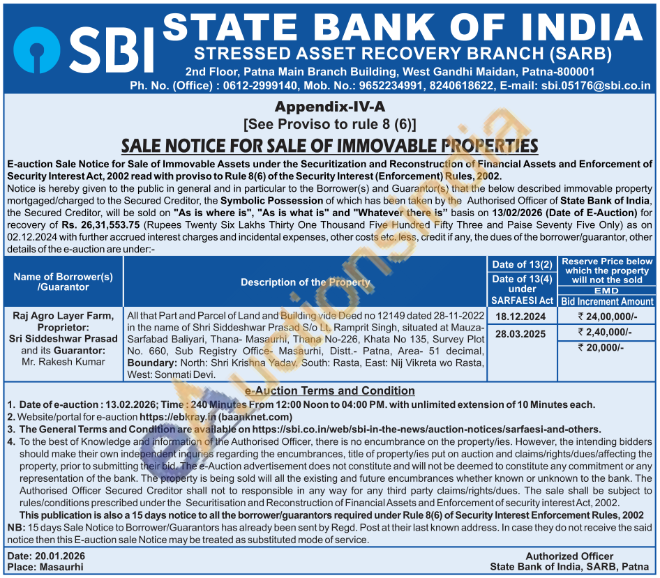 All that Part and Parcel of Land and Building vide Deed no 12149 dated 28-11-2022 in the name of Shri Siddeshwar Prasad S/o Lt. Ramprit Singh, situated at Mauza-Sarfabad Baliyari, Thana- Masaurhi, Thana No-226, Khata No 135, Survey Plot No. 660, Sub Registry Office- Masaurhi, Distt. Patna, Area 51 decimal, Boundary: North: Shri Krishna Yadav, South: Rasta, East: Nij Vikreta wo Rasta, West: Sonmati Devi.