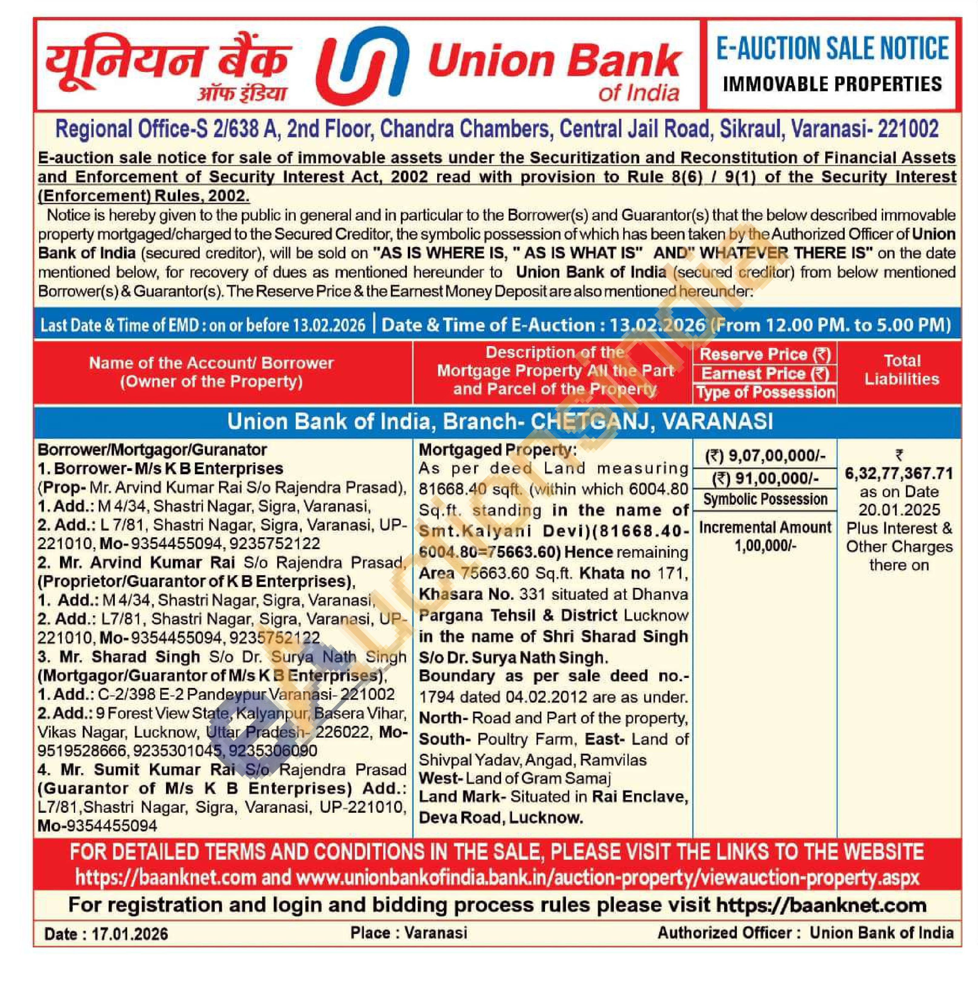 As per deed Land measuring 81668.40 sqft. (within which 6004.80 Sq.ft. standing in the name of Smt.Kalyani Devi) (81668.40-6004.80-75663.60) Hence remaining Area 75663.60 Sq.ft. Khata no 171, Khasara No. 331 situated at Dhanva Pargana Tehsil & District Lucknow in the name of Shri Sharad Singh S/o Dr. Surya Nath Singh. Boundary as per sale deed no.-1794 dated 04.02.2012 are as under. North-Road and Part of the property, South- Poultry Farm, East- Land of Shivpal Yadav, Angad, Ramvilas West-Land of Gram Samaj Land Mark- Situated in Rai Enclave, Deva Road, Lucknow