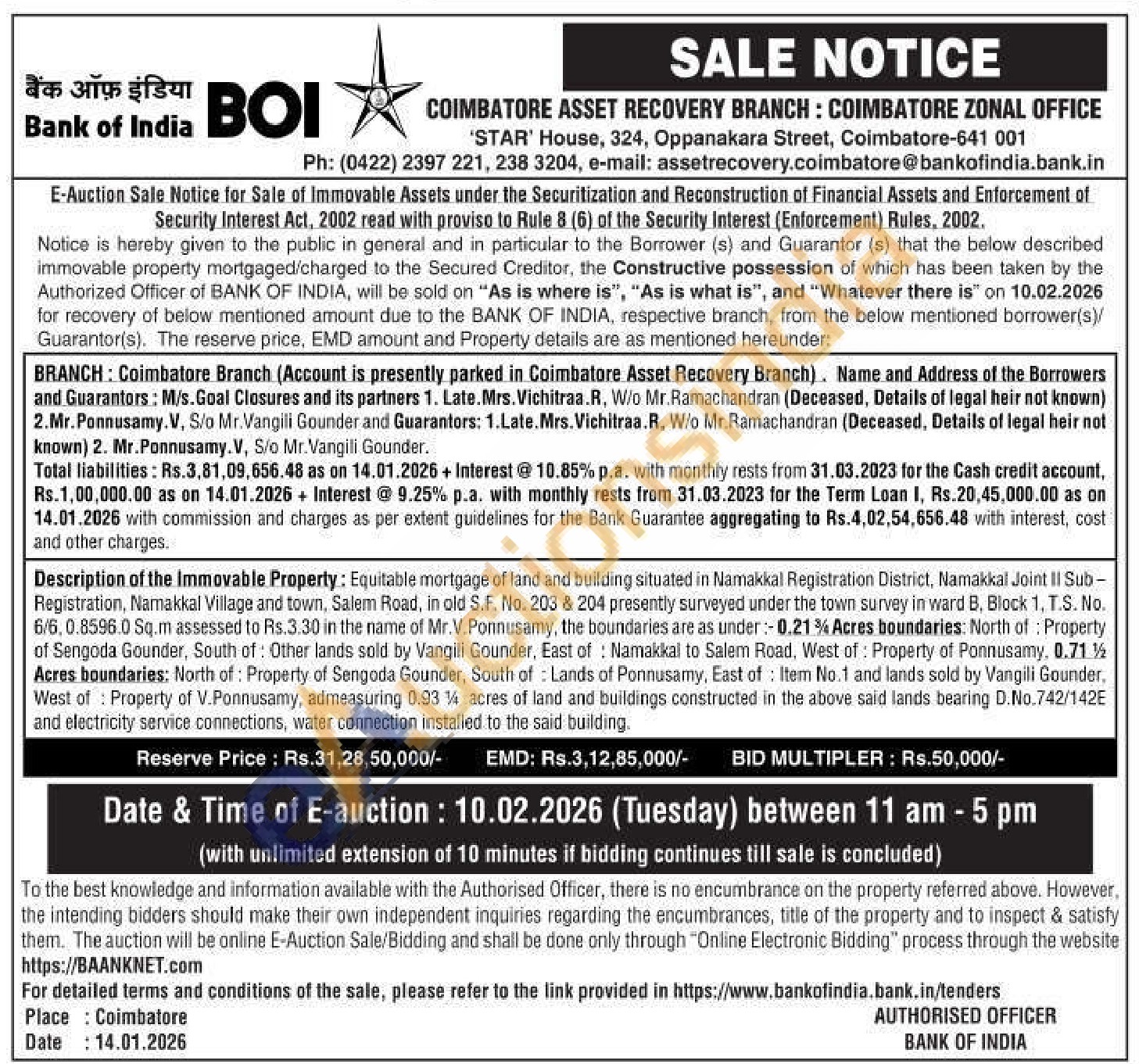 Contact no : (0422) 2397 221, 238 3204, e-mail: assetrecovery.coimbatore@bankofindia.bank.in